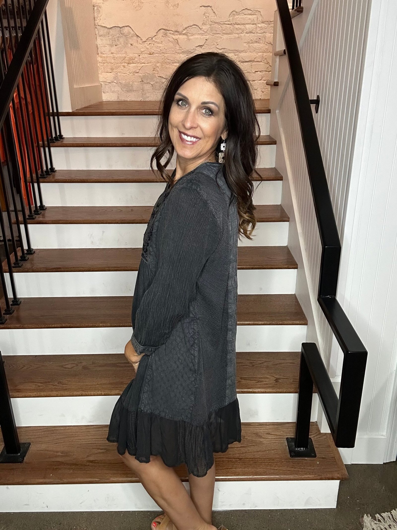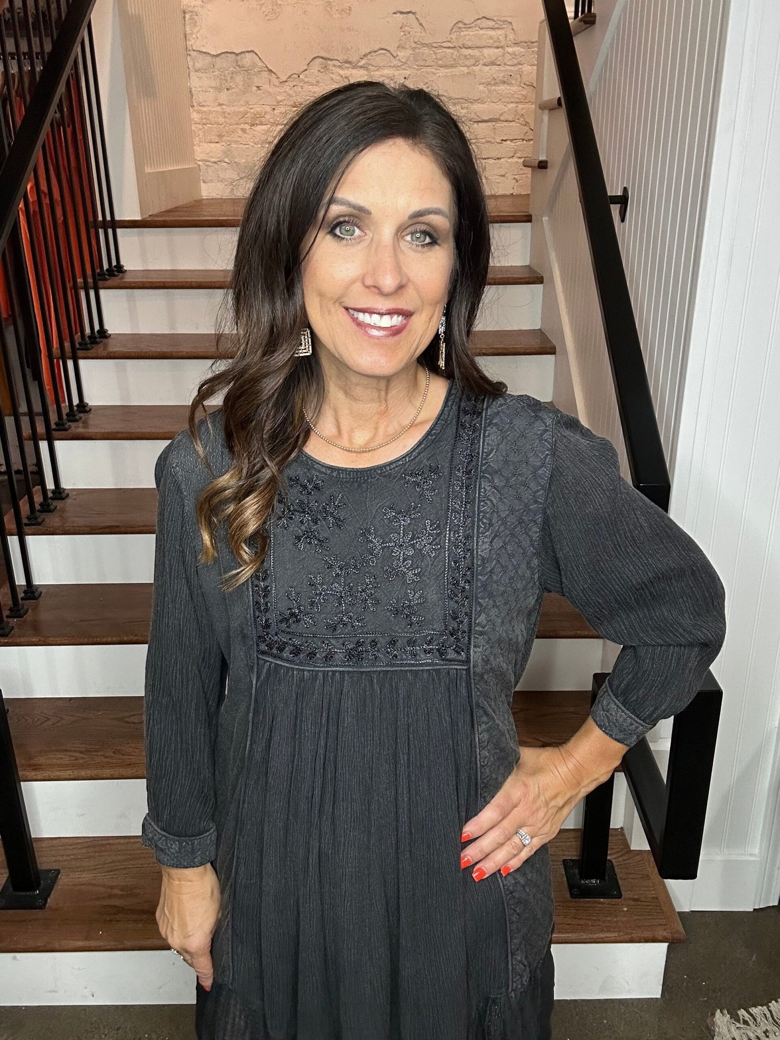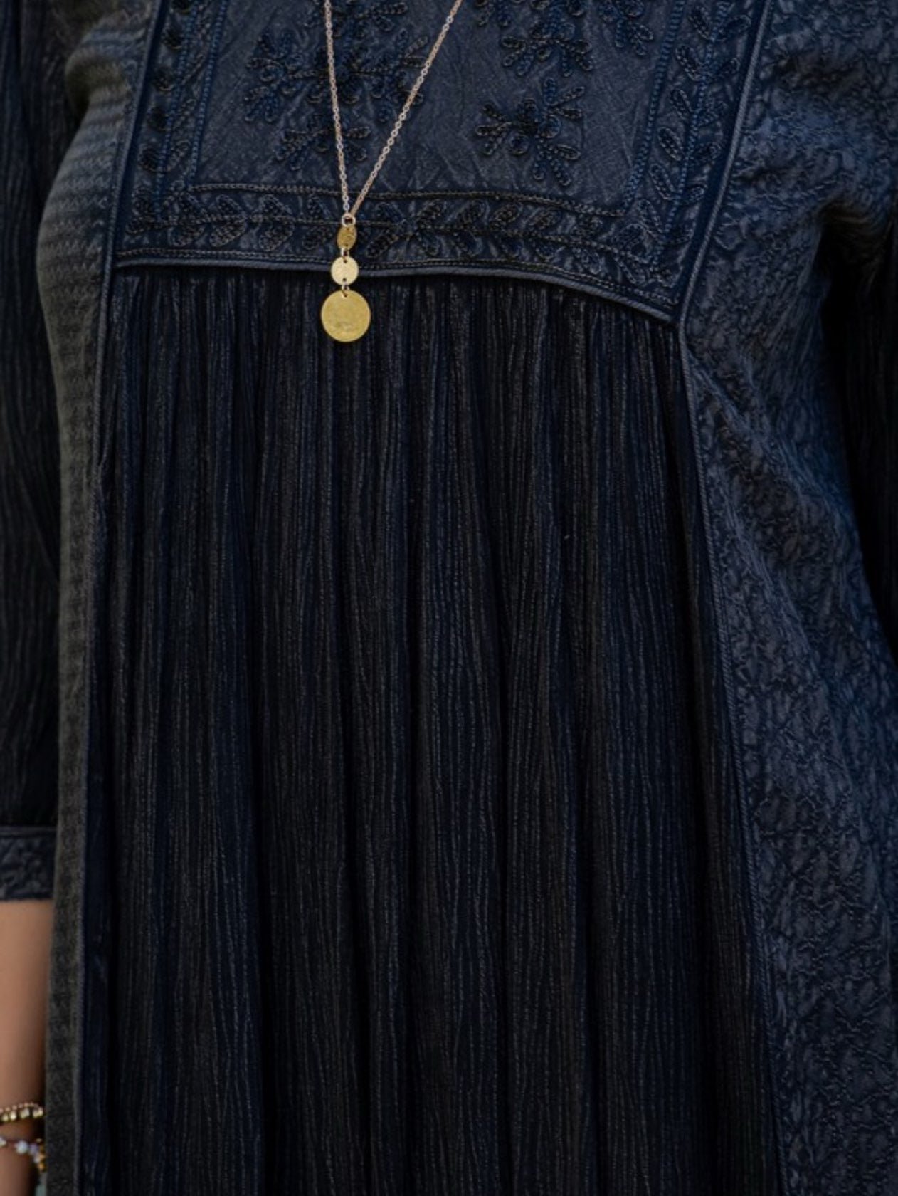 Style: Boho embroidered babydoll dressMaterial: Rayon crepe, ideal for fall and winter Embroidery: Intricate aari embroidery on the round neck Design: 3/4 sleeves with patchwork details for a boho flair Length: Above the knee or mid thigh, with a relaxed babydoll silhouetteTexture: Soft, slightly textured crepe fabricComfort: Warm and breathable, perfect for cooler weather Care Instruction: Hand wash for the best careDetails: A stylish boho babydoll dress with aari embroidery and patchwork accents, offering a cozy yet fashionable look for fall and winter.