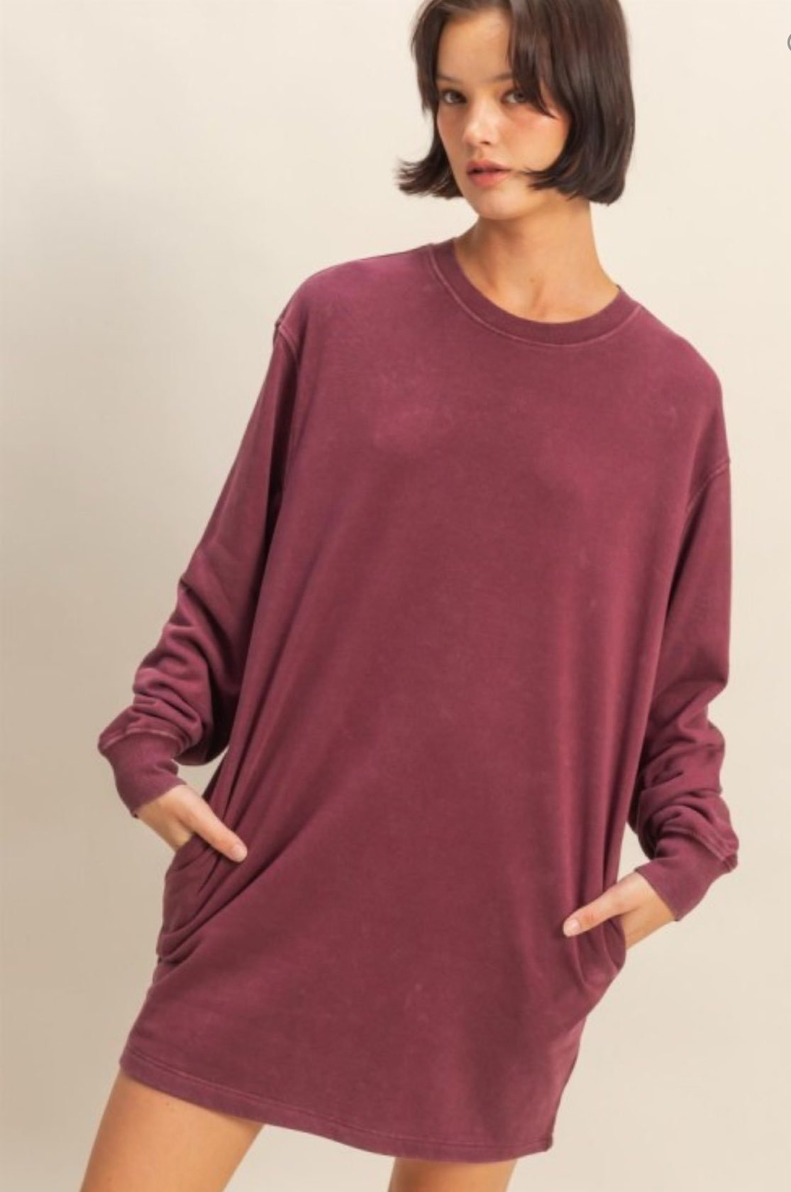 Embrace cozy comfort with this oversized sweatshirt dress.Designed for a relaxed fit, this dress features dropped shoulders and long sleeves, making it perfect for lounging or casual outings.The soft, washed fabric adds a touch of vintage charm, while the simple, clean lines make it a versatile addition to your wardrobe.Pair it with sneakers or boots for an effortless, stylish look.Self: 80% Cotton 20% PolyesterContrast: 95% Cotton 5% Spandex
