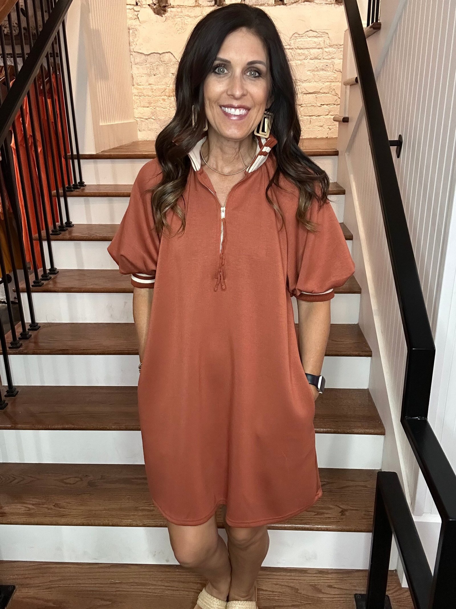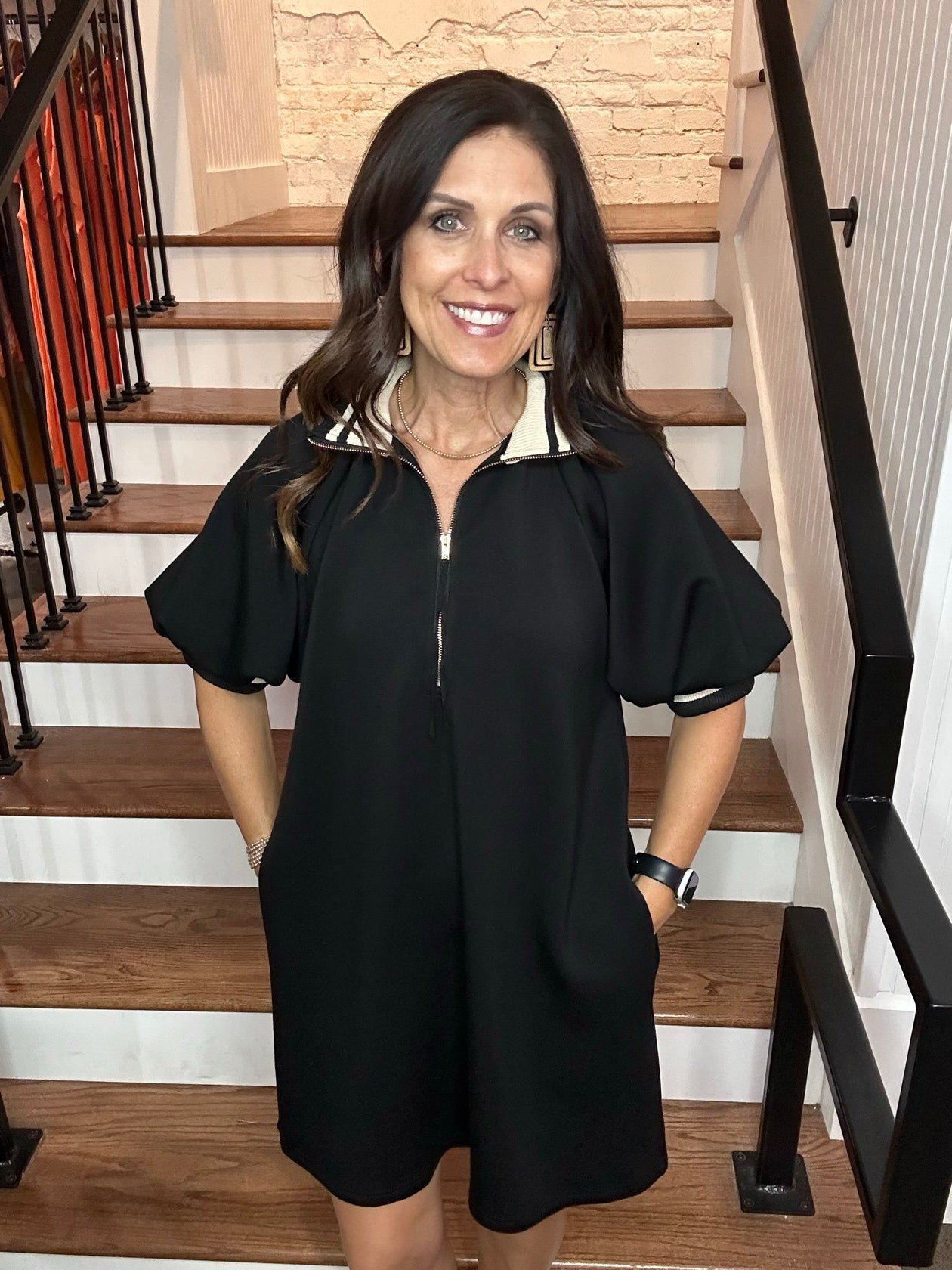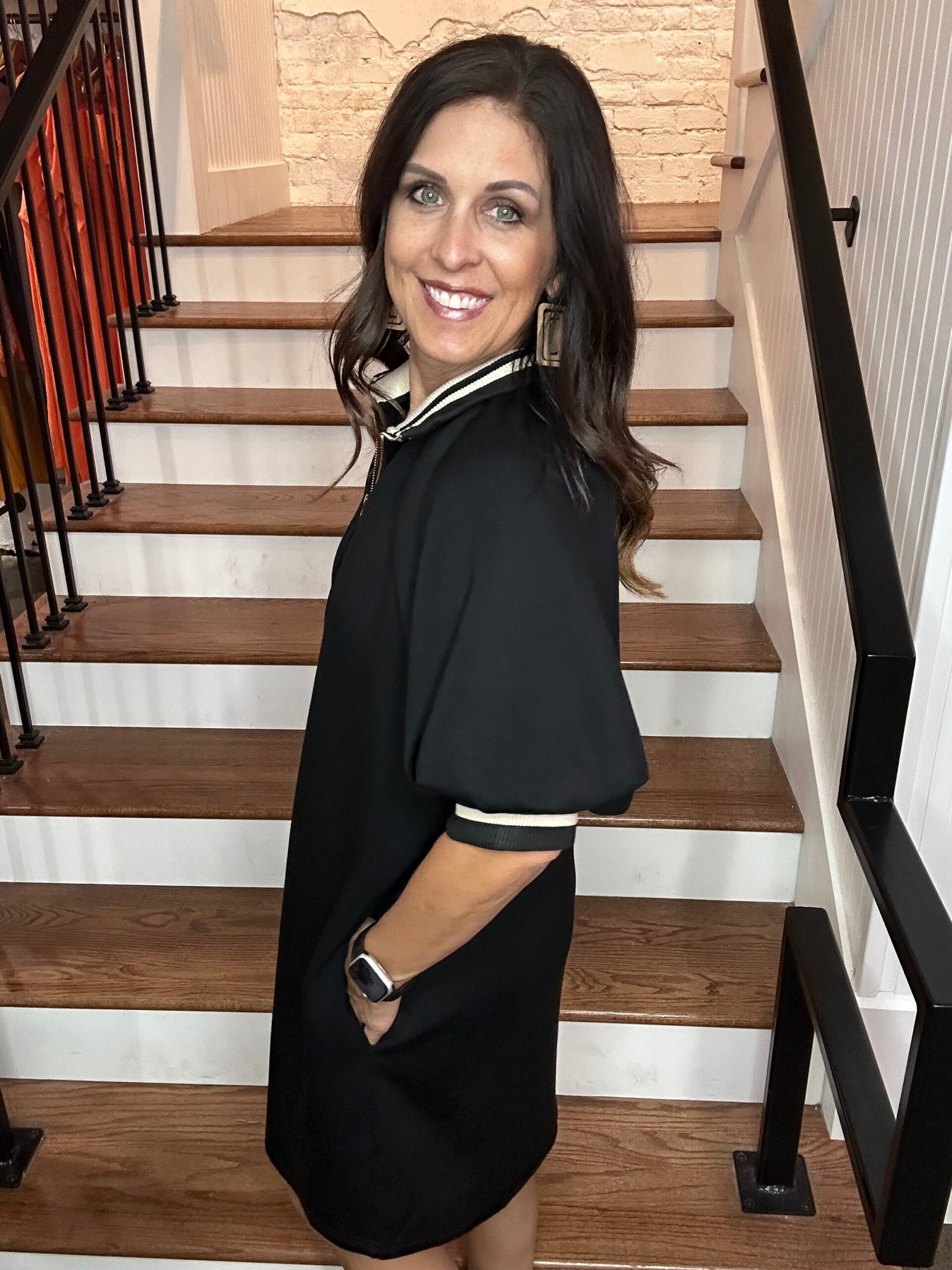 Solid mini dress with front zipper and multicolor ribbed trim. Side pockets. Unlined. Knit. Non-sheer. Lightweight.Fabric Content 55%RAYON 40%POLYESTER 5%SPANDEX