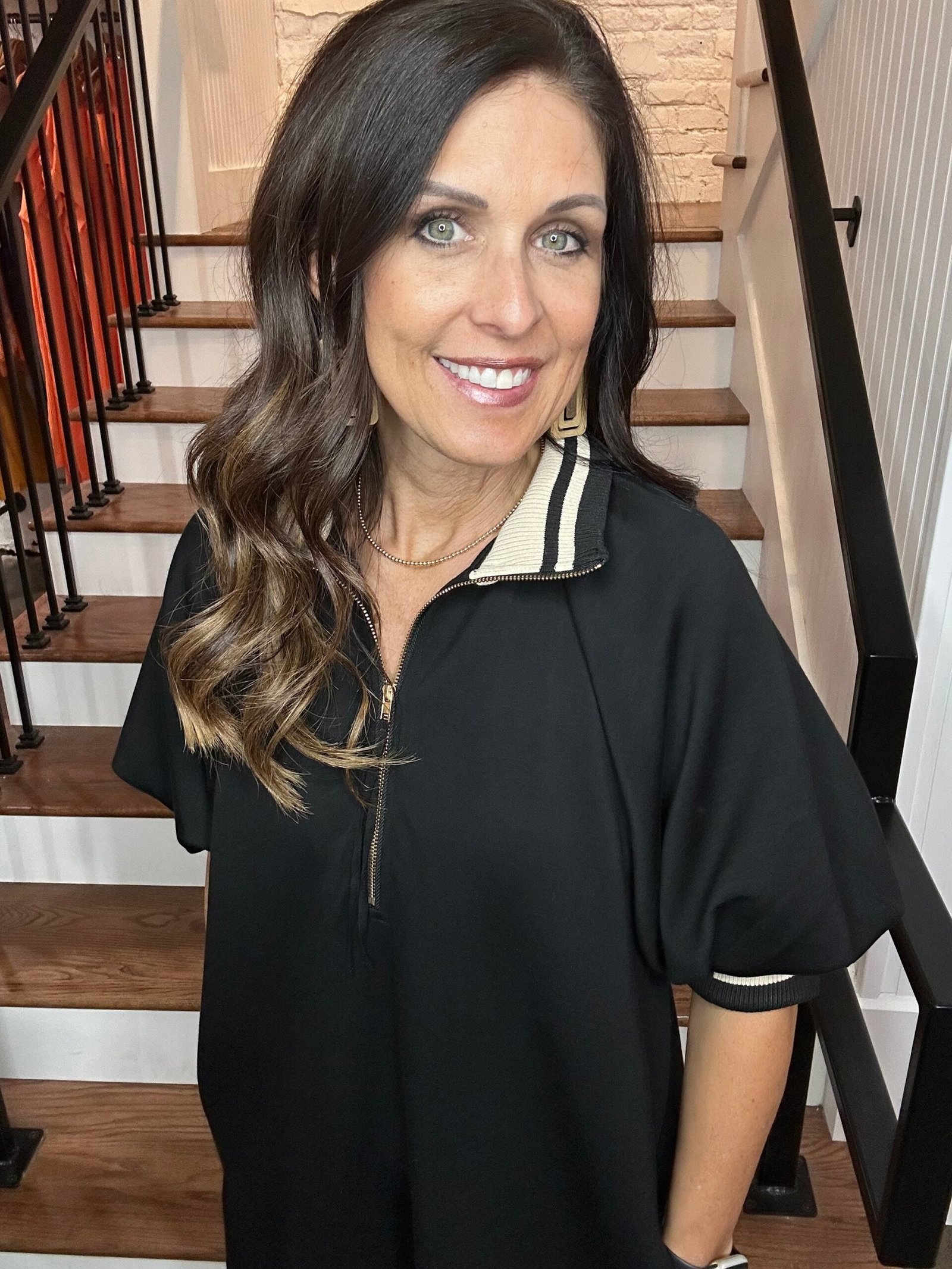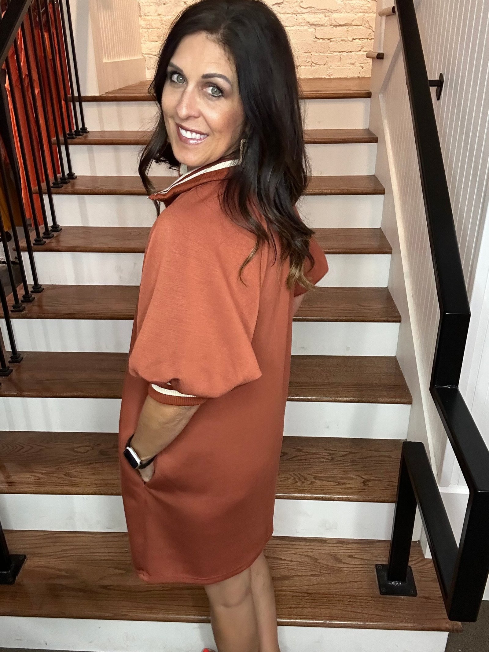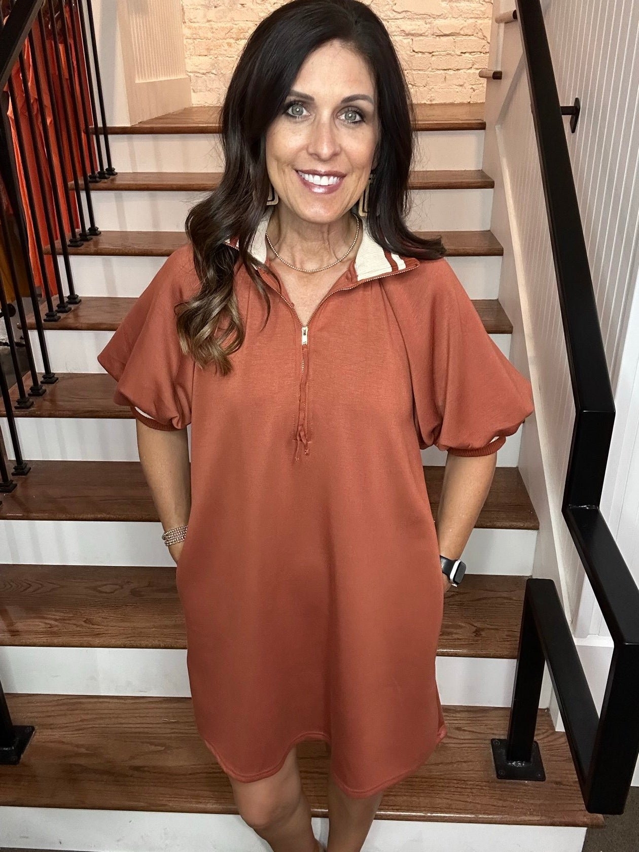 Solid mini dress with front zipper and multicolor ribbed trim. Side pockets. Unlined. Knit. Non-sheer. Lightweight.Fabric Content 55%RAYON 40%POLYESTER 5%SPANDEX